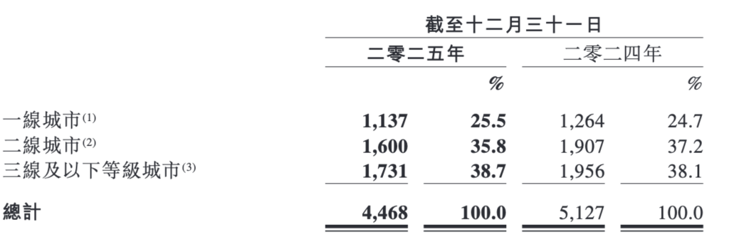 财报显示,去年加盟门店数量在4460家,上年同期在5116家,据计算门店数同比下滑12.82%。其中由集团管理的加盟店占比进一步提升至81.4%。去年加上少数自营门店后的整体门店数在4468家,数量同比下滑12.85%。门店分布方面,一线城市门店数占比提升至25.5%,三线及以下城市门店数量占比提升至38.7%。二线城市占比下滑至35.8%。