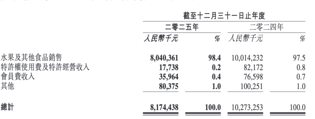 百果园集团有超98%的收入来自水果及其他食品销售,其余收入来自特许权使用费及特许经营收入、会员收入及其他收入。线下门店以加盟模式为主,包括集团管理和委托管理的加盟门店。