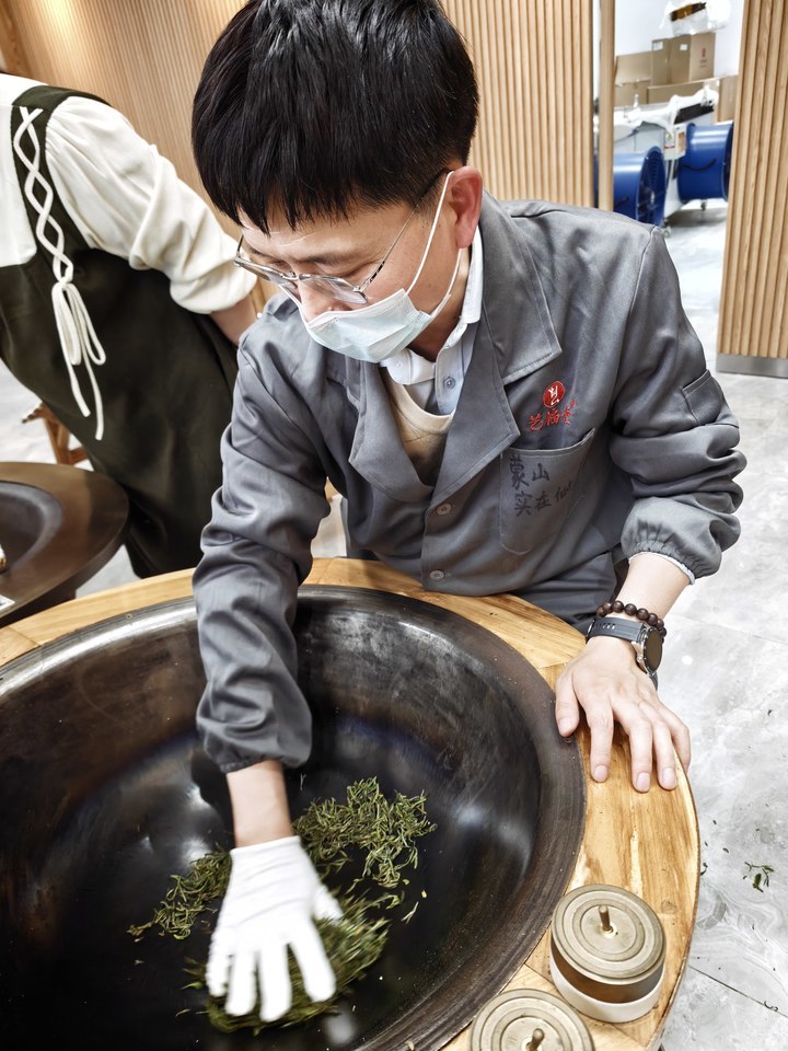 二级技师于晓顺向访客展示炒茶工艺