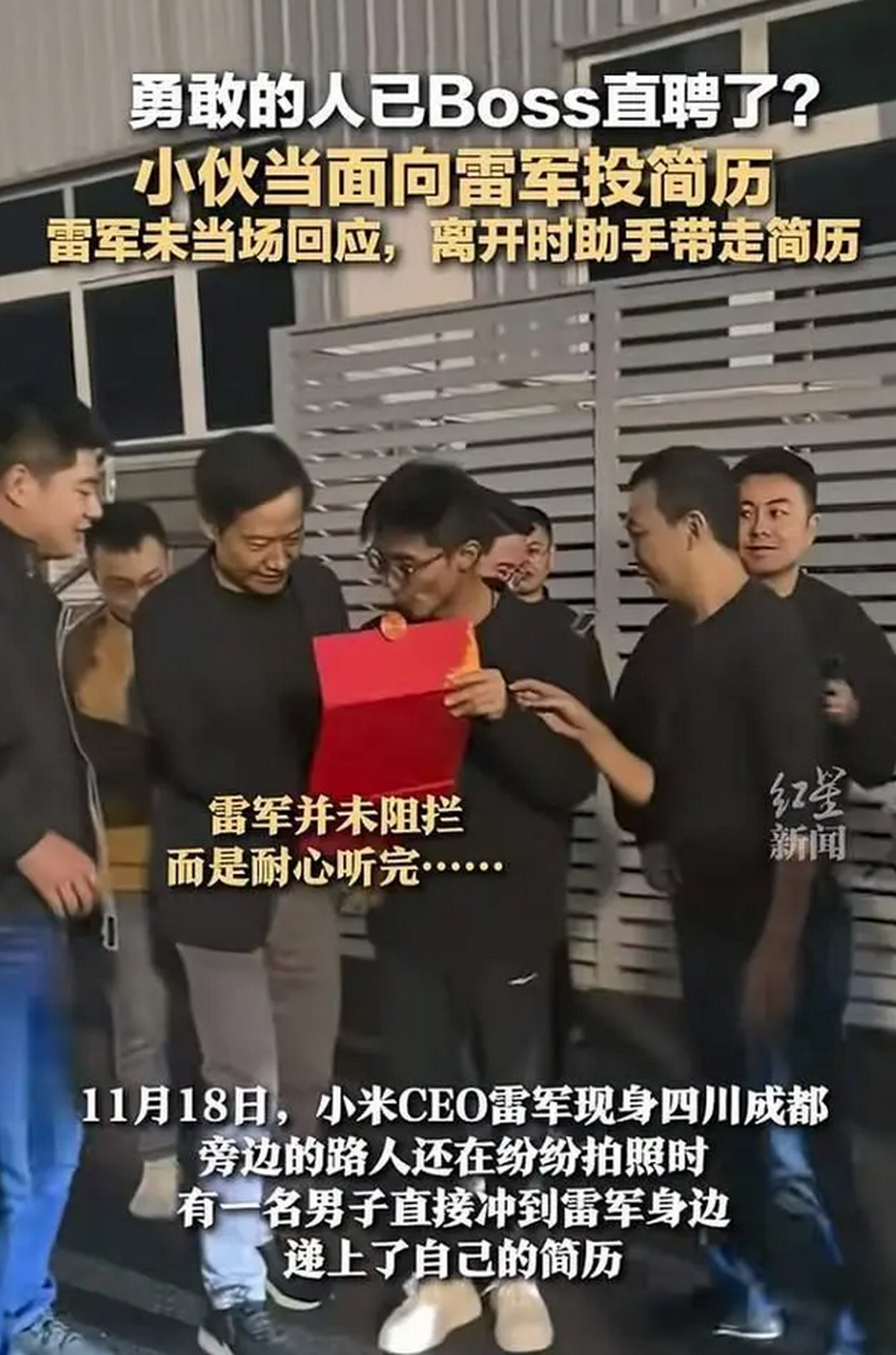 据红星新闻,11月18日,雷军现身四川成都。旁边的路人还在纷纷拍照时,有一名男子直接冲到雷军身边,递上了自己的简历。网友热议:“一个真敢递一个真敢接”“真boss直聘”“有勇气”……