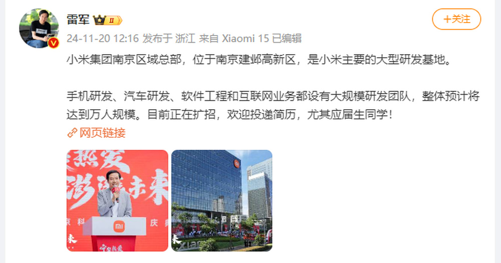 11月20日,雷军在个人微博发文称:“小米集团南京区域总部,位于南京建邺高新区,是小米主要的大型研发基地。手机研发、汽车研发、软件工程和互联网业务都设有大规模研发团队,整体预计将达到万人规模。目前正在扩招,欢迎投递简历,尤其应届生同学!”