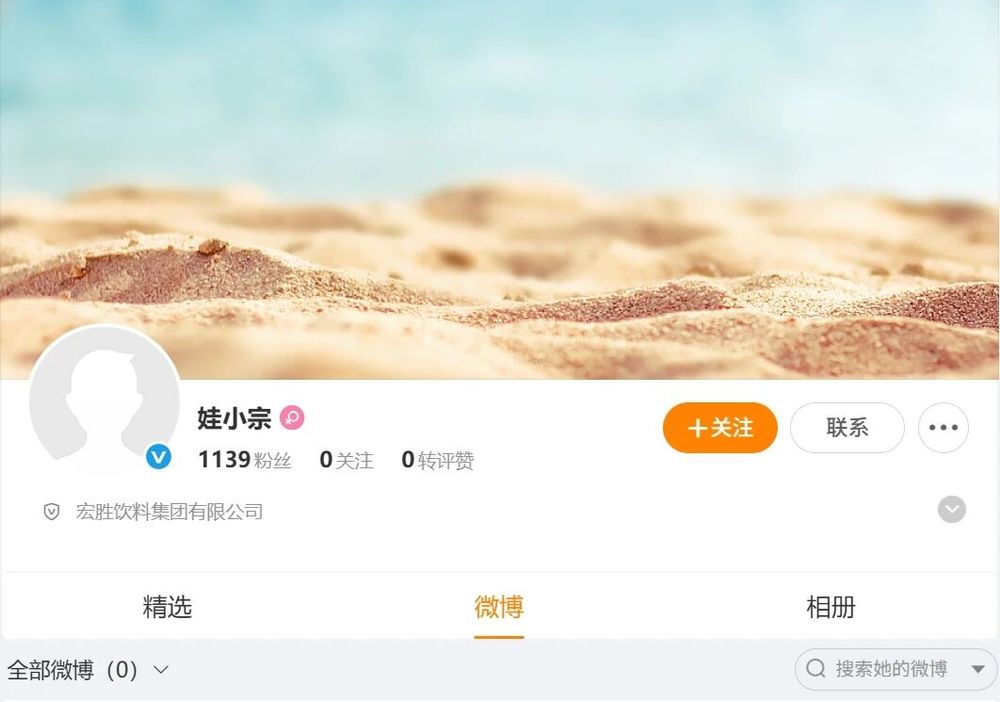 10月11日,一个名为“娃小宗”的微博账号已完成平台认证。检索信息显示,该账号认证主体为宏胜饮料集团有限公司,审核通过时间为9月30日,目前粉丝数1139,暂未发布任何内容。