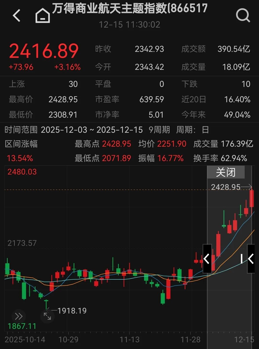 受上述消息影响,A股今日商业航天板块大涨,万得商业航天主题指数涨超3%,自朱雀三号发射以来,累计涨幅达13.54%。