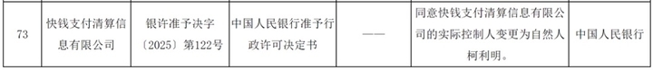 近日,中国人民银行官网显示,同意快钱支付清算信息有限公司(以下简称“快钱支付”)的实际控制人变更为自然人柯利明。