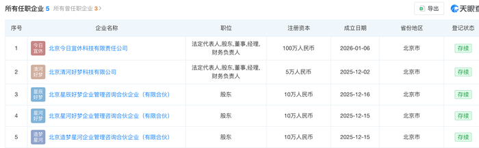 任职信息显示,王腾名下关联5家企业,均为存续状态。除上述新公司外,还包括北京清河好梦科技有限公司、北京星辰好梦企业管理咨询合伙企业(有限合伙)、北京星河好梦企业管理咨询合伙企业(有限合伙)、北京造梦星河企业管理咨询合伙企业(有限合伙)。值得一提的是,上述企业均为近期新成立。