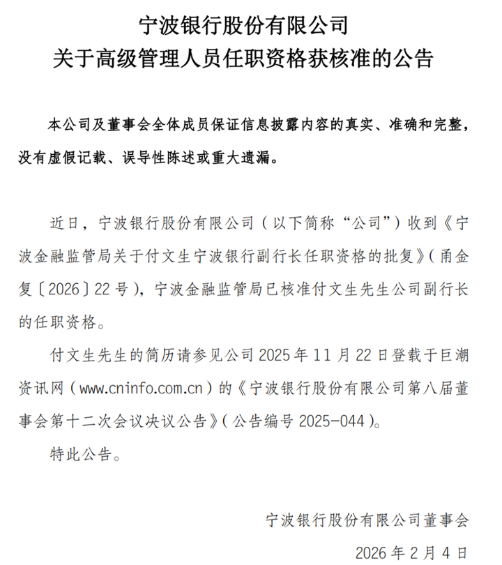 2月3日,宁波银行发布公告称,近日收到宁波金融监管局批复,宁波金融监管局已核准付文生副行长的任职资格。