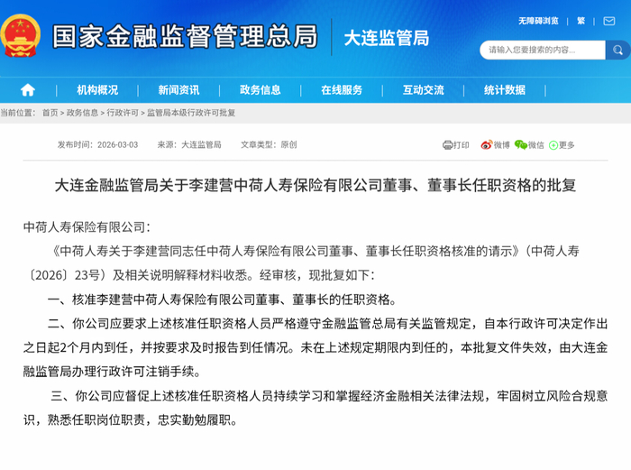 3月3日,国家金融监督管理总局大连监管局批复文件显示,已于近日核准李建营担任中荷人寿保险有限公司董事、董事长。记者注意到,其于去年5月就已任公司党委书记职务,并多次参与公开活动。