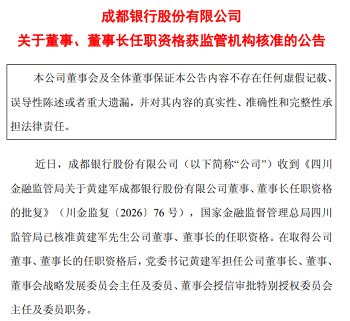 3月12日,成都银行发布公告称,该行于近日收到四川金融监管局行政批复,已核准黄建军成都银行董事、董事长的任职资格。