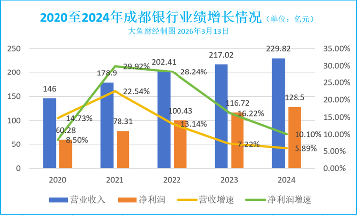 成都银行近两年业绩增速有所放缓,2021至2022年,该行净利润增速均保持在20%以上,2023年开始净利润增速逐渐放缓,2024年时,该行实现净利润128.5亿元,同比增长10.1%。