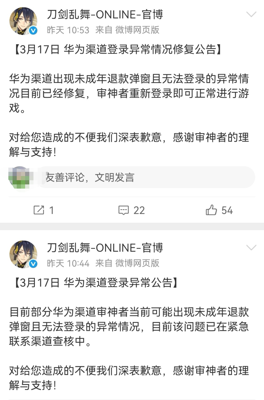 @刀剑乱舞-ONLINE-官博 公告,“目前部分华为渠道审神者当前可能出现未成年退款弹窗且无法登录的异常情况,目前该问题已在紧急联系渠道查核中。”随后不久,该官博又发布消息称,异常情况目前已经修复,重新登录即可正常进行游戏。