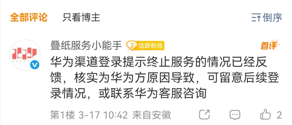 叠纸客服官方微博 @叠纸服务小能手 回复玩家称,“华为渠道登录提示终止服务的情况已经反馈,核实为华为方原因导致,可留意后续登录情况,或联系华为客服咨询。”