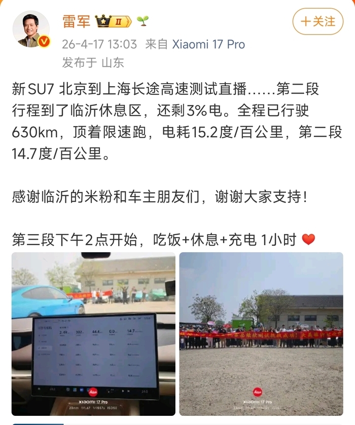 雷军到达临沂后发文称,“新SU7北京到上海长途高速测试直播,第二段行程到了临沂休息区,还剩3%电。全程已行驶630km,顶着限速跑,电耗15.2度/百公里,第二段14.7度/百公里。感谢临沂的米粉和车主朋友们,谢谢大家支持!第三段下午2点开始,吃饭+休息+充电1小时。”