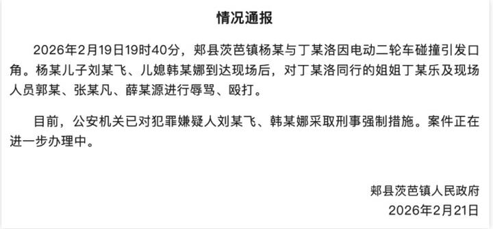 据当地情况通报显示,2月19日19时40分,杨某与丁某洛因电动二轮车碰撞引发口角。