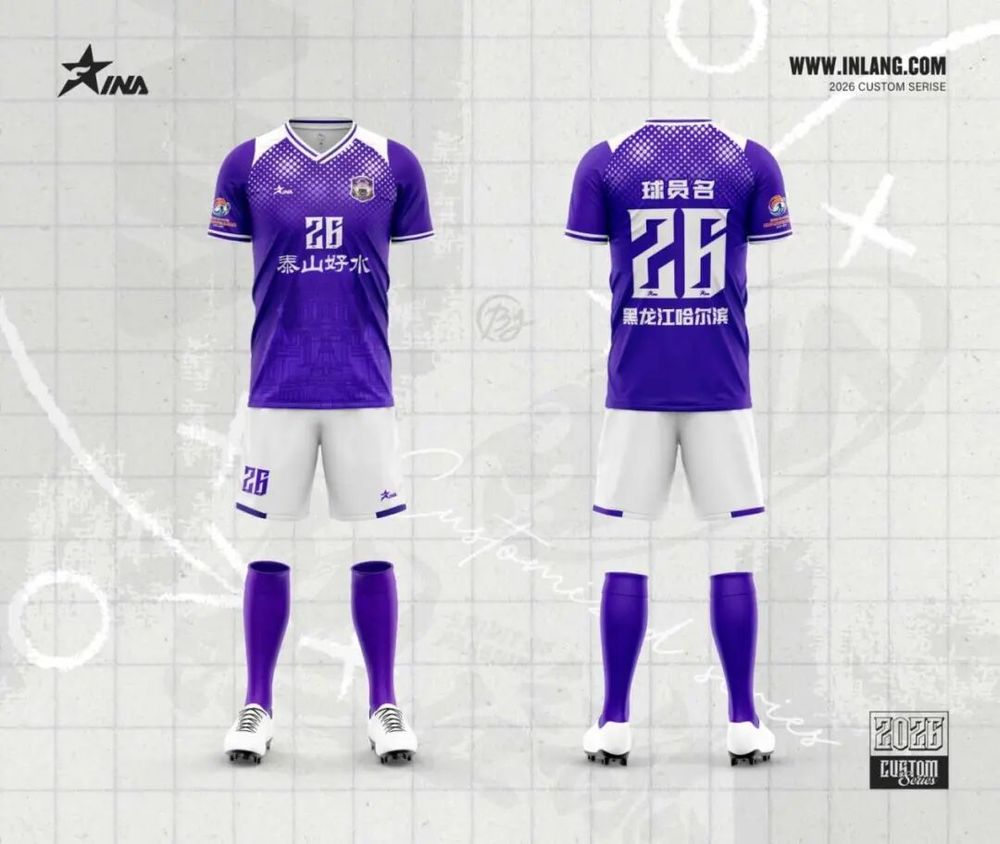 哈尔滨队主场球衣以丁香紫为主色,融合圣索菲亚大教堂、花丁香、漫天雪花三大城市标志性意象,打造兼具浪漫气质与冰雪风骨的绿茵战袍。紫色承载丁香花的柔美圣洁,呼应圣索菲亚大教堂的庄严典雅,更契合冰城冬日的梦幻氛围。衣身暗纹提炼大教堂穹顶轮廓与建筑线条,庄重沉稳,象征球队根基扎实、坚韧不屈;搭配渐变雪花飘落肌理,层次灵动,寓意球队团结芬芳、轻盈灵动,在赛场上灵动穿梭、势如破雪。整体设计将冰城人文底蕴、城市气质与足球运动完美融合,让球员身披城市印记,优雅与锐气兼具,团结与拼搏共生。