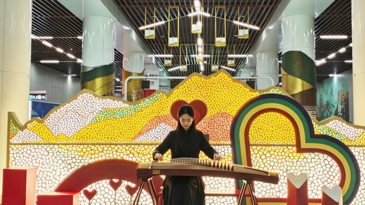 特邀演奏者现场演绎古风音乐,让悠扬旋律为通勤路注入诗意。