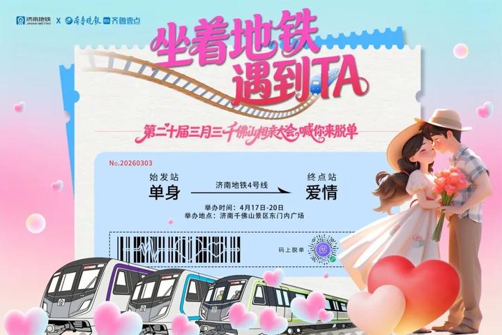 乘车至千佛山站,在“坐着地铁遇到TA”宣传牌前,或至奥体中心站、转山西路(万象城)站易拉宝处打卡,将照片或视频发布至微信朋友圈、微信视频号、抖音、小红书等平台,文案中带上“乘地铁 赴春约”话题并集赞。4月17日上午10:00,凭点赞界面至千佛山站宣传牌处即可兑换济南地铁文创礼品: