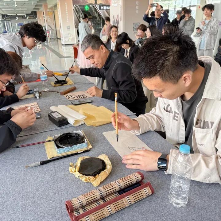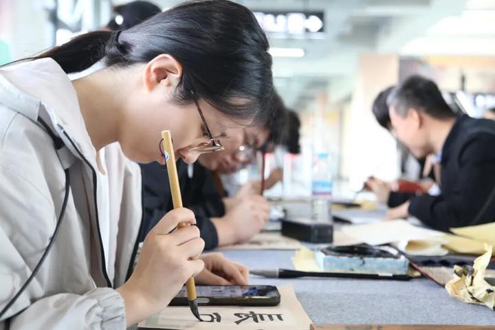 以声传书,阅见美好。山东职业学院站聚焦传统文化与阅读深度融合,联动山东职业学院师生带来沉浸式国风体验。“以声传书,阅见美好”诵读环节,乘客主动上台分享阅读感悟,共同感受文字的力量;中阮、琵琶等传统雅乐演奏悠扬动听,让音律与书香碰撞交融;笔墨书写区,市民在现场指导下挥毫落笔,临摹诗句、书写心愿,感受翰墨书香之美;甲骨文猜字、活字印刷体验两大特色互动更是成为打卡热点,让古老文化在趣味参与中焕发新生。