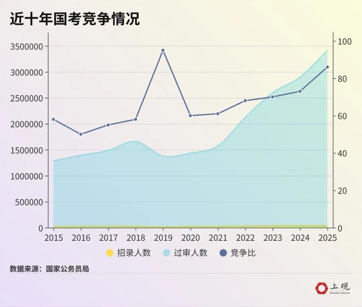 2025年国考共计划招录3.97万人,截至网上报名与资格审查工作结束,共有341.6万人通过了资格审查,今年的竞争比(即通过资格审查人数与录用计划数之比)为86:1。这一数值是近五年来最高,算是“卷”出新高度了,在高报名人数的同时,高考试率背后是就业焦虑。