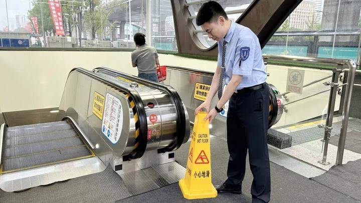 车站工作人员加强对站厅、站台、出入口、设备房等重点区域以及站外标识、垂梯等设施设备的巡查,同时在地铁站铺设防滑垫,并及时清理水渍,保持地面清洁,细心提醒每一位过往乘客“小心地滑”。