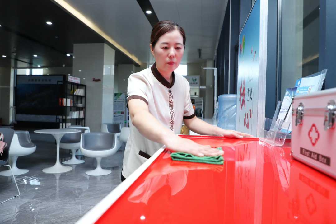 园区清洁服务始终以客户感知为导向、以客户需求为核心,通过可视化呈现标准化作业流程、清洁制度与执行标准,让客户直观了解各区域清洁规范与频次。保洁团队严格落实细节标准,确保办公空间与公共区域持续干净明亮,为客户营造清新舒适的办公环境,有效提升入住体验与满意度。同时,环境部积极推行5S管理法,通过科学分区、标签明示、流程上墙打造标准化保洁工作间,实现清洁工具与物料高效管理,提升作业效率与响应速度;日常清洁中,团队以客户动线为核心规划作业流程,将基础保洁与周期性专项清洁结合,高标准保障电梯厅、走廊、卫生间等高频区域,彻底消除卫生死角,确保核心空间始终洁净有序,让客户在优美舒心的环境中专注工作,持续强化办公体验与环境满意度。