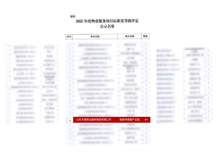 10月29日,济南市物业管理协会2025年度物业服务项目标准化等级评定结果正式揭晓,山东天城物业服务集团有限公司申报的智能传感器产业园项目经标准化专家现场评价、公正评审、集体研究等多轮评选,成功获评2025年度物业服务项目标准化4A等级项目,标志着天城服务集团的标准化服务能力获行业权威认可。