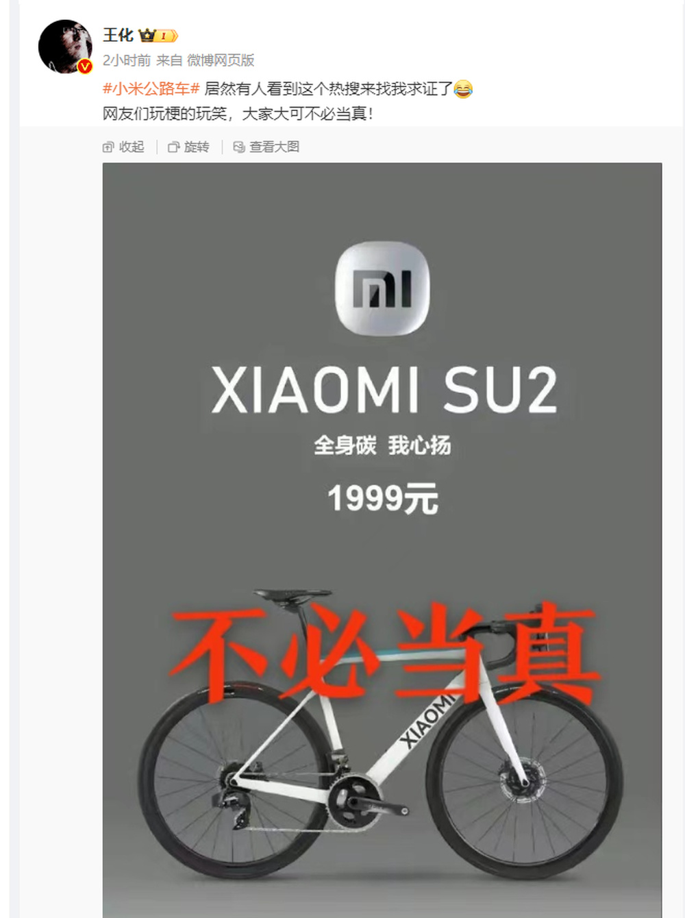 当天,一张图片在网络热传。图片上是一辆标有“xiaomi”字样的公路自行车,还写有“XIAOMI SU2 全身碳 我心扬”以及售价“1999元”等内容。