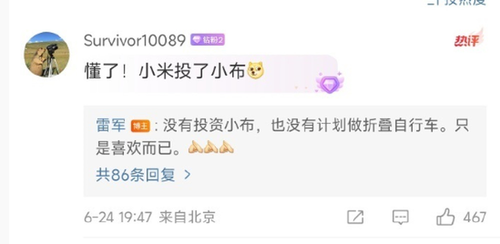 6月份小米董事长雷军曾在个人社交媒体晒出一段自己骑自行车上班通勤的视频,称偶尔骑车吹吹风还是挺舒服的,大家上班一起加油。视频中自行车品牌为英国品牌Brmopton,也被称为“小布”。网友称雷军所骑的车型疑似售价15900元, 有网友表示希望小米也能早日出自行车。随后雷军在微博评论区回复网友,称没有做折叠自行车的计划。