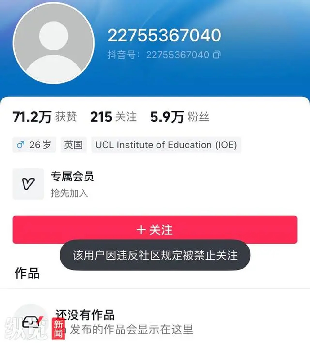 梁勇的短视频账号已被禁止关注。(来源/梁咏短视频账号截图)