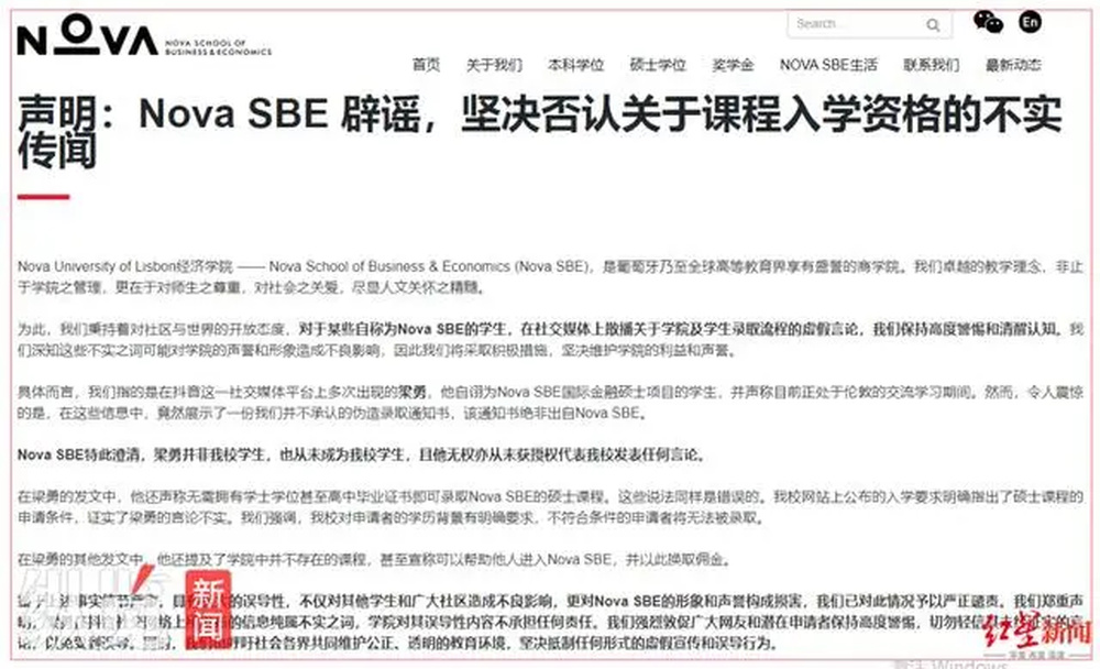 声明还指出,在梁勇的其他发文中,他还提及了学院中并不存在的课程,甚至宣称可以帮助他人进入Nova SBE,并以此换取佣金。鉴于上述事实情节严重,具有极大的误导性,不仅对其他学生和广大社区造成不良影响,更对Nova SBE的形象和声誉构成损害,我们已对此情况予以严正谴责。Nova SBE建议广大网友和潜在申请者保持高度警惕,切勿轻信其未经证实的言论,以免受到误导。