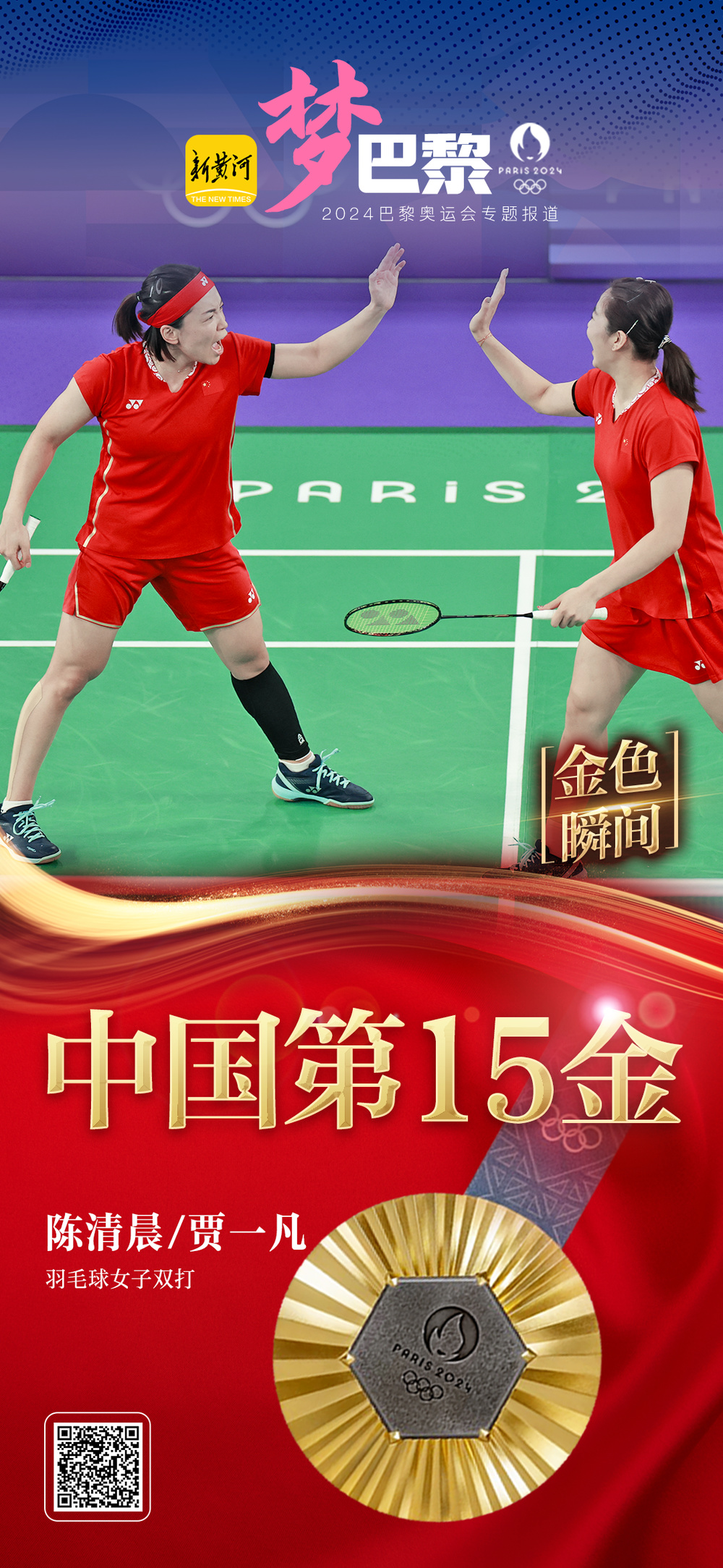 在刚刚结束的巴黎奥运会羽毛球混双决赛中,中国组合陈清晨/贾一凡战胜队友刘圣书/谭宁,斩获了中国代表团在本届赛事中的第15枚金牌。