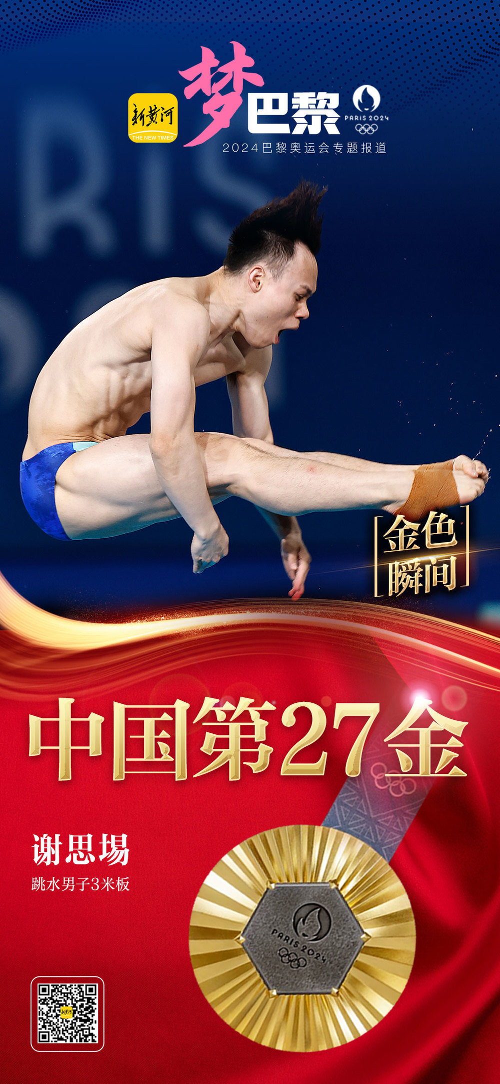 北京时间8月8日晚,巴黎奥运会跳水男子3米板决赛,中国选手谢思埸夺得冠军,成功卫冕,另一名中国选手王宗源获得亚军,这是中国代表团在本届奥运会上夺得的第27金。