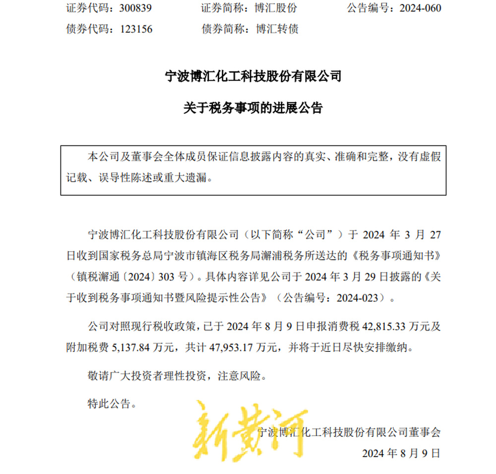8月11日,宁波博汇化工科技股份有限公司(证券代码:SZ300839,简称博汇股份)公告,公司对照现行税收政策,已于2024年8月9日申报消费税4.28亿元及附加税费5137.84万元,共计4.8亿元,并将于近日尽快安排缴纳。同日发布异动公告,目前公司正积极进行复工复产前期准备工作。