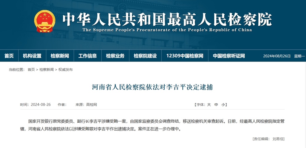 最高检8月26日消息,国家开发银行原党委委员、副行长李吉平涉嫌受贿一案,由国家监察委员会调查终结,移送检察机关审查起诉。日前,经最高人民检察院指定管辖,河南省人民检察院依法以涉嫌受贿罪对李吉平作出逮捕决定。案件正在进一步办理中。