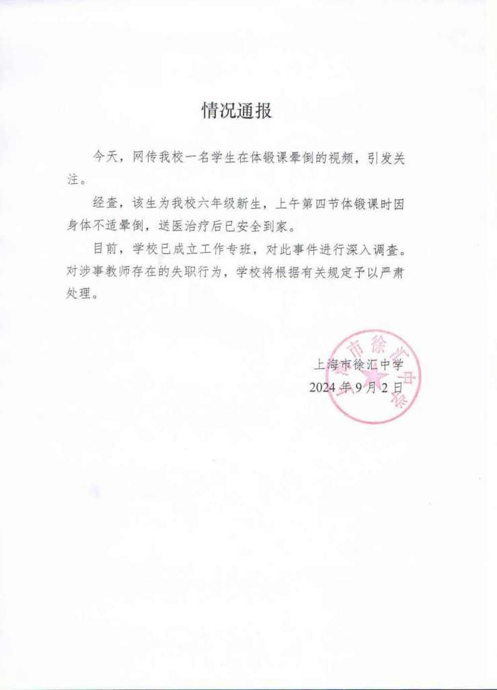 当晚,澎湃新闻记者从上海市徐汇中学获悉,该学生为徐汇中学六年级新生,上午第四节体锻课时因身体不适晕倒,送医治疗后已安全到家。目前,学校已成立工作专班,对此事件进行深入调查。对涉事教师存在的失职行为,学校将根据有关规定予以严肃处理。