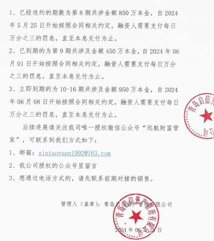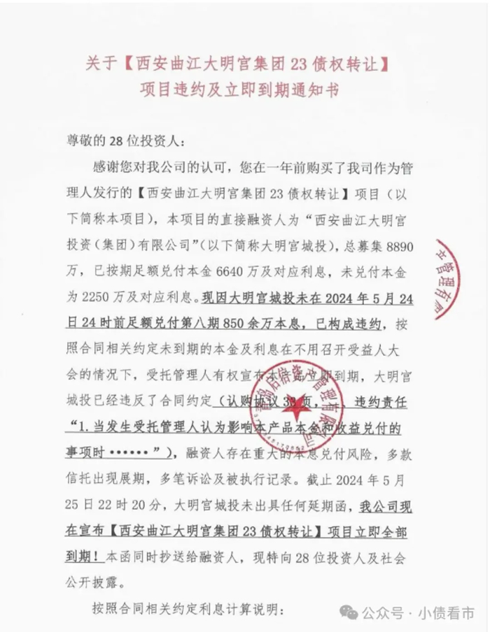 一家资管公司发布如此措辞激烈的讨债声明非常罕见。新黄河记者梳理发现,这不是青岛启信资管第一次公开讨债。早在今年5月25日,青岛启信资管曾经发布过一则公告,文中表示,因大明宫城投未在2024年5月24日24时前足额兑付第八期850余万元本息,已构成违约,按照合同相关约定未到期的本金及利息在不用召开受益人大会的情况下,受托管理人有权宣布本产品立即到期。大明宫城投已经违反了合同约定,融资人存在重大的本息兑付风险,多款信托出现展期、多笔诉讼及被执行记录。“截至2024年5月25日22时20分,大明宫城投未出具任何延期函,我公司现在宣布【西安曲江大明宫集团23债权转让】项目立即全部到期!本函同时抄送给融资人,现特向28位投资人及社会公开披露。”
