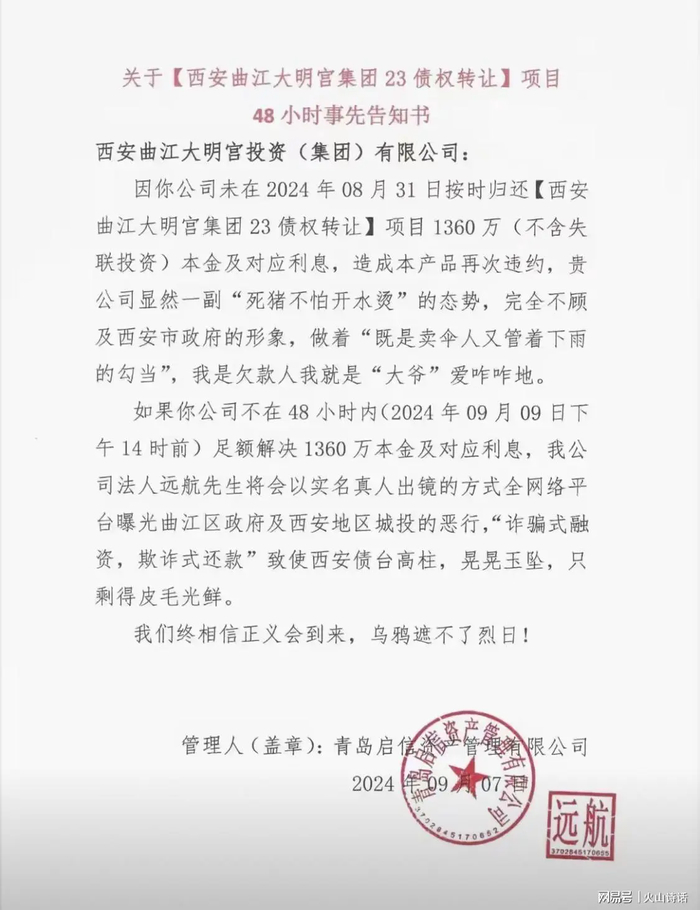 青岛启信资管发文称如果西安曲江城投48小时内无法偿还本息,则该企业公司法人将通过网络直播进行公开曝光讨债。