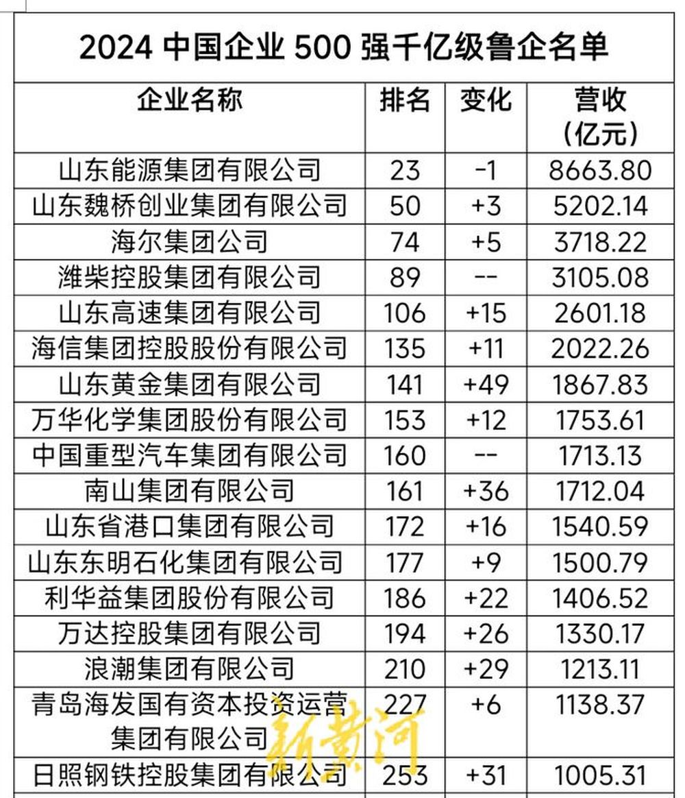 从同期发布的2024中国跨国公司100大及跨国指数看,海尔集团、潍柴集团、山东能源集团、海信集团、魏桥集团、山东高速集团、山东如意时尚投资控股有限公司、南山集团、万华化学集团9家鲁企登榜。