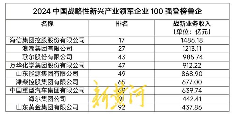 放眼全球,战略性新兴产业是引领未来发展的新支柱、新赛道。从同期发布的2024中国战略性新兴产业领军企业100强看,山东有9家企业登榜,分别为海信集团、浪潮集团、歌尔、万华化学、山东能源集团、潍柴集团、中国重汽集团、海尔集团、山东黄金集团,这些企业均为2024中国企业500强,且8家为营收过千亿的鲁企。