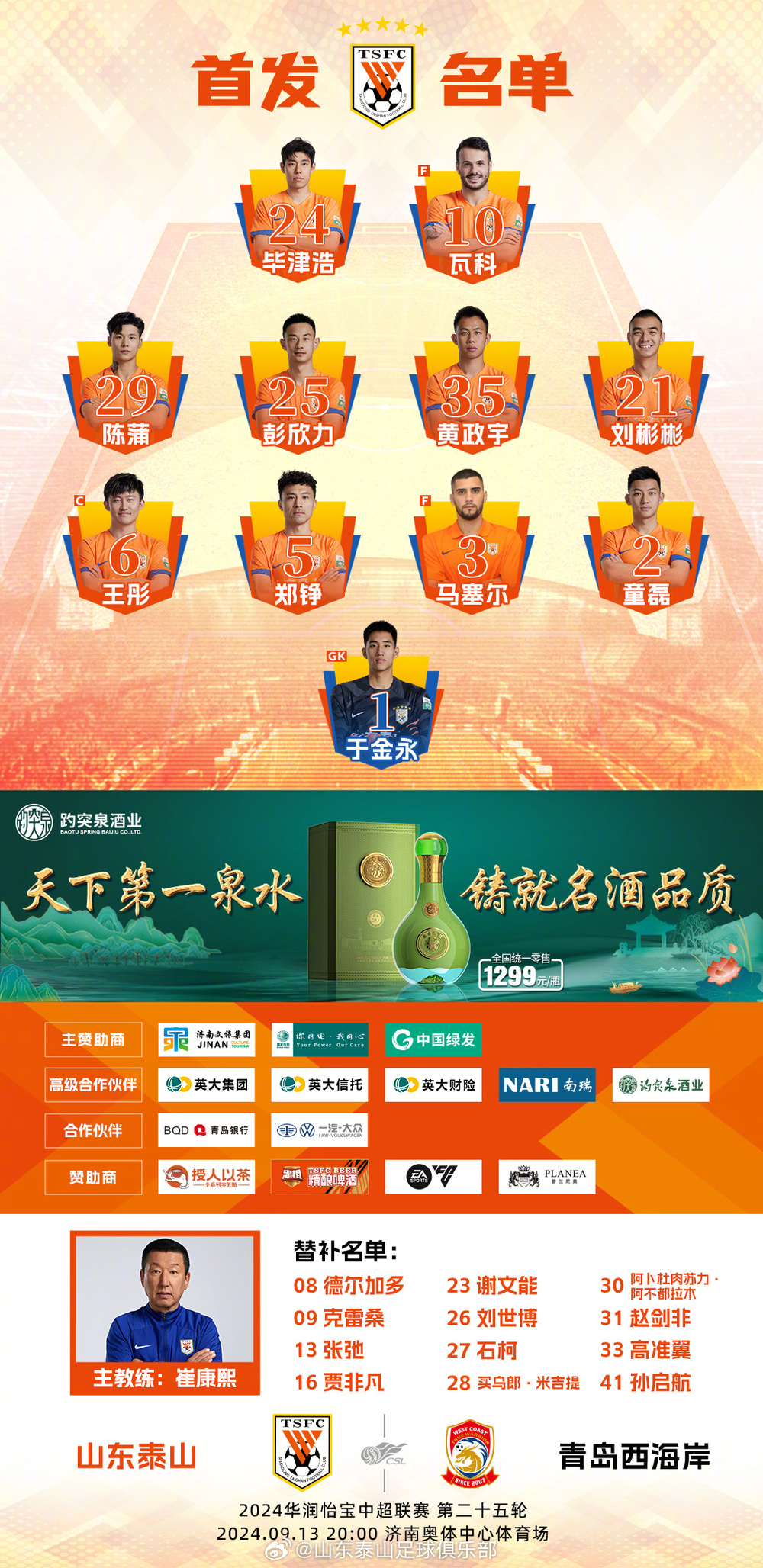 山东泰山替补:26-刘世博、41-孙启航、8-德尔加多(F)、9-克雷桑(F)、13-张弛、16-贾非凡、23-谢文能、27-石柯、28-买乌郎-米吉提、30-阿卜杜肉苏力-阿不都拉木、31-赵剑非、33-高准翼