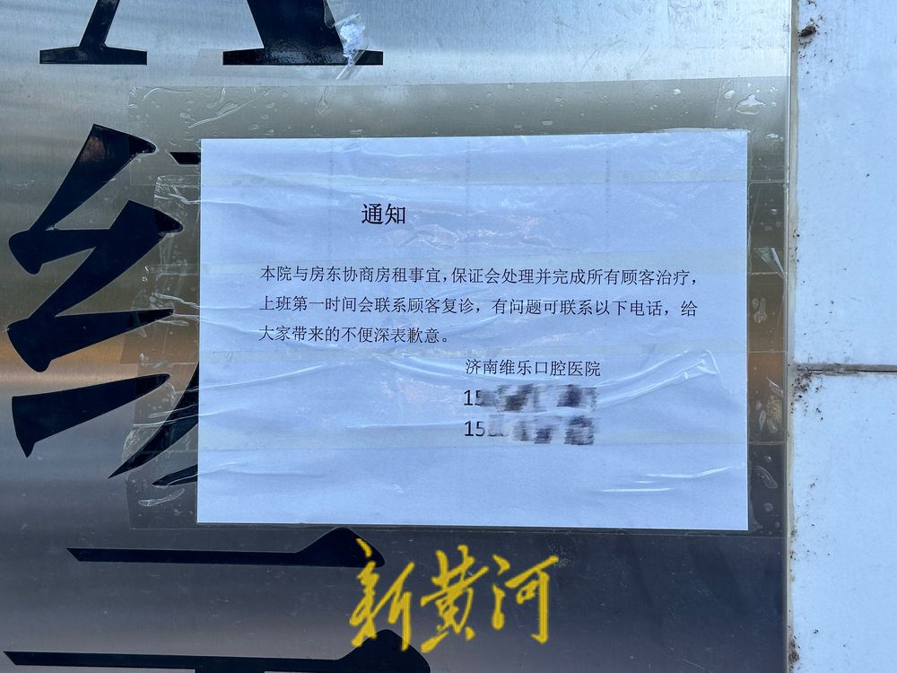 “今年6月,我在明湖东路的维乐口腔花了9000多块钱进行种植牙治疗,等种植体在牙槽骨中生长牢固之后,9月中旬本想到医院安装牙冠,没想到医院关门了。”张先生根据医院在门口张贴的电话联系到医院的工作人员,“和我对接的工作人员说,大明湖总店因为房租的问题暂时关店,可以到奥体西路的万科店继续进行治疗,我去万科店那边发现也关门了。”