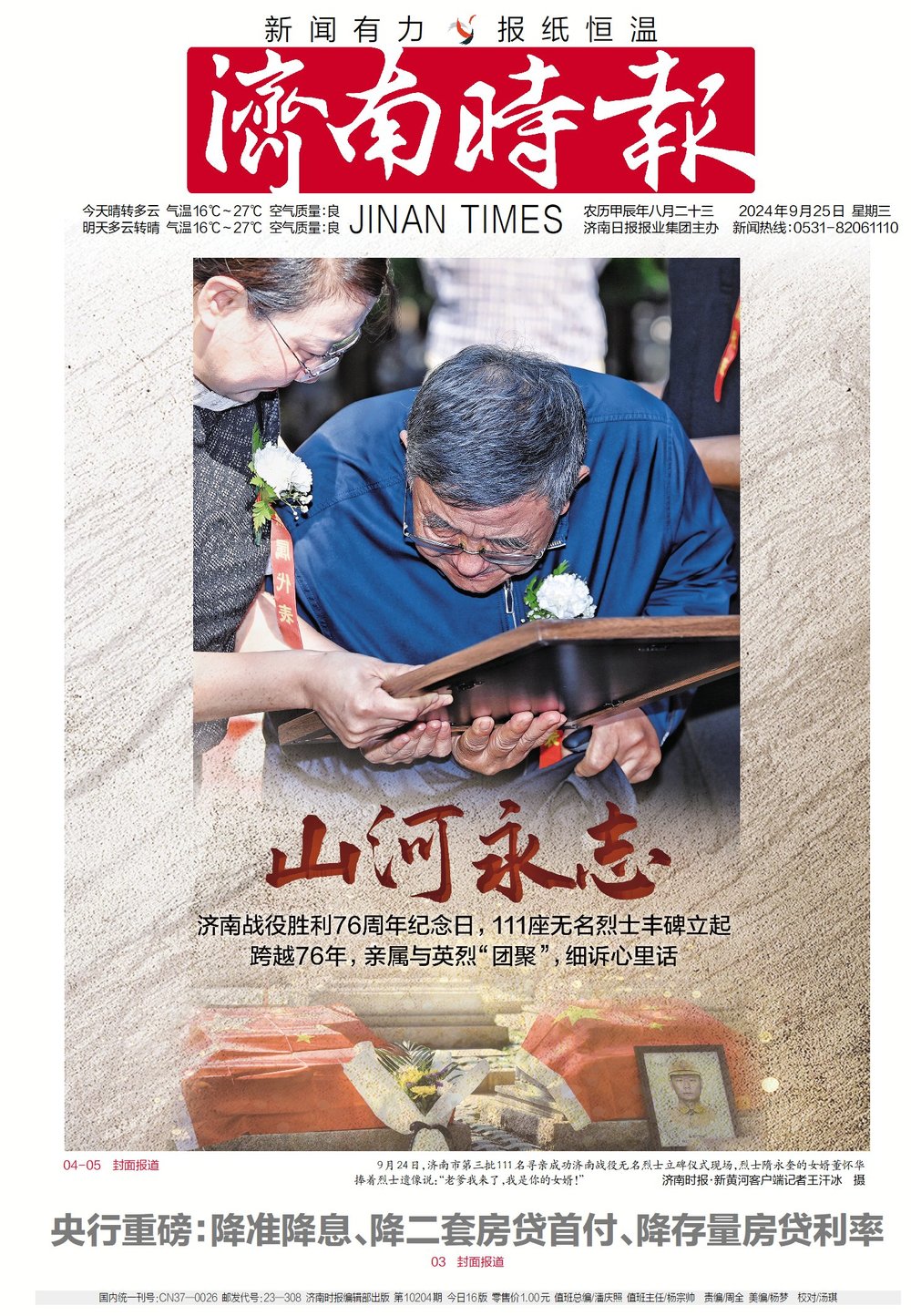 今年9月24日是济南战役胜利76周年纪念日,济南市为第三批寻亲成功的济南战役无名烈士举行立碑仪式。英雄山上,再次立起了111座“丰碑”。从此,无名烈士变“有名”。跨越76年,他们终与亲人“团聚”。详情>>