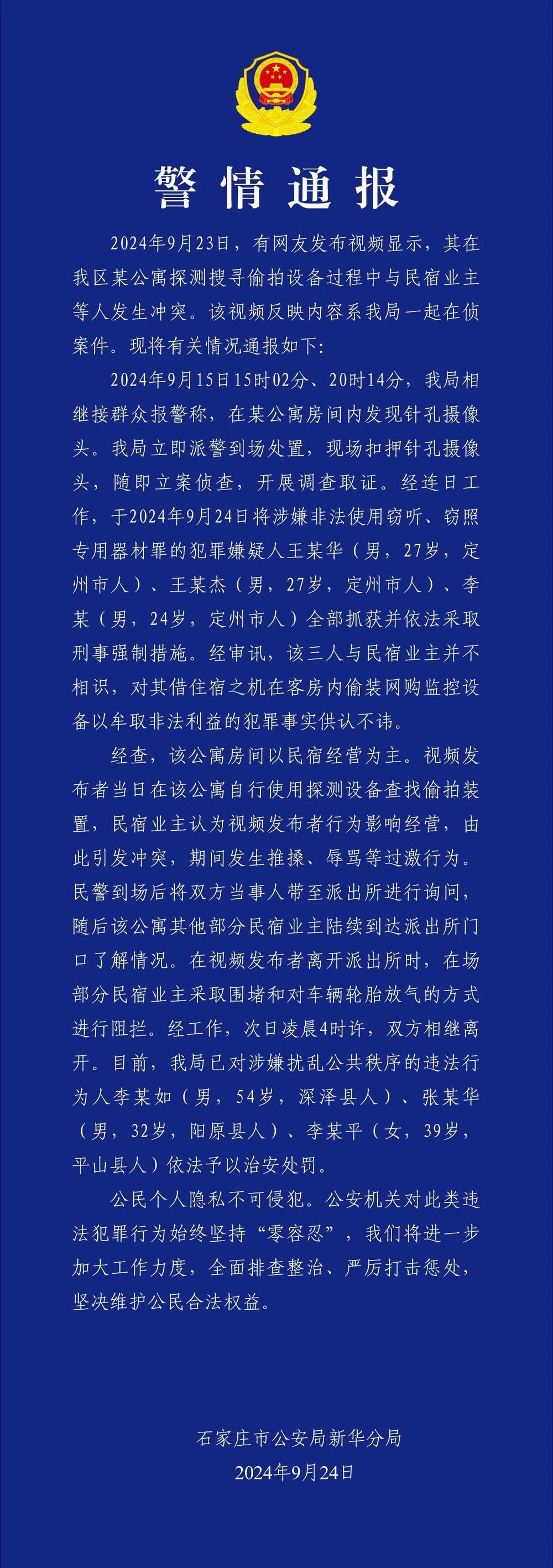 ●9月24日晚,石家庄市公安局新华分局发布警情通报,回应网友称其在新华区某公寓探测搜寻偷拍设备过程中与民宿业主等人发生冲突事件。