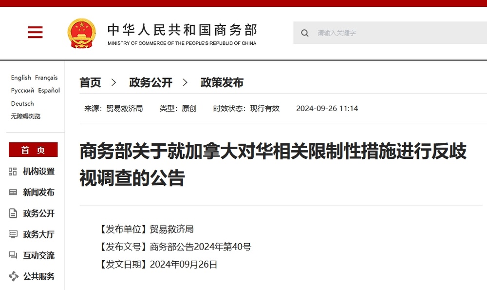 依据《中华人民共和国对外贸易法》第三十六条、第三十七条规定,商务部决定自2024年9月26日起对加拿大相关被调查措施启动反歧视调查。现将有关事项公告如下: