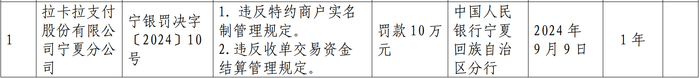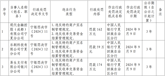 9月9日,现代金融控股(成都)有限公司宁夏分公司、乐刷科技有限公司宁夏分公司、易生支付有限公司银川分公司、拉卡拉支付股份有限公司宁夏分公司均因涉及违反特约商户实名制管理规定、违反收单交易资金结算管理规定的违法行为,分别被罚162万元、59万元、174万元、10万元。