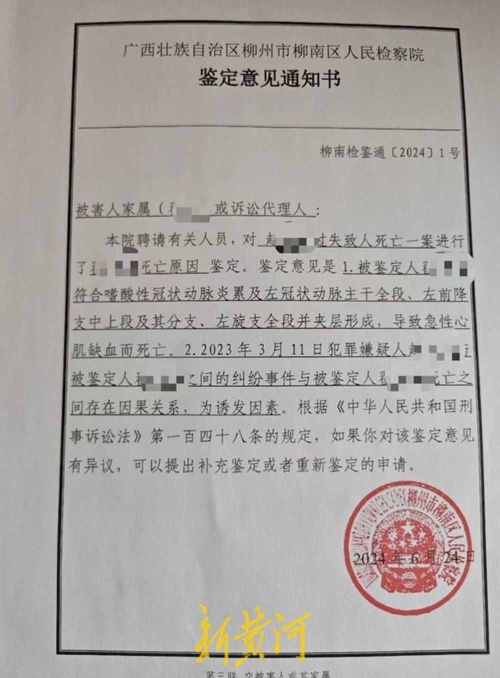 10月14日,新黄河记者从翟华处获悉,重新鉴定的申请通过后,他找到北京的一家司法鉴定中心重新做了鉴定。根据翟华提供的,由柳州市柳南区人民检察院出具的鉴定意见通知书内容显示,“被鉴定人翟莉符合嗜酸性冠状动脉炎累及左冠状动脉主干全段、左前降支中上段及其分支、左旋支全段并夹层形成,导致急性心肌缺血而死亡。2023年3月11日犯罪嫌疑人赵某明与被鉴定人翟莉之间的纠纷事件,与被鉴定人翟莉死亡之间存在因果关系,为诱发因素。”