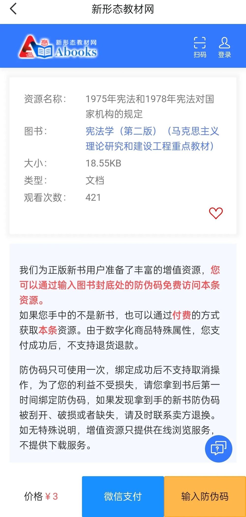 大皖新闻记者注意到,引发争议的教材为《宪法学》(第二版),出版社为高等教育出版社和人民出版社。10月16日,记者扫描书中二维码后,出现相应文字资源名称的同时,下方还有“输入防伪码”和“微信支付”两个选项,并清晰标注了价格为3元。