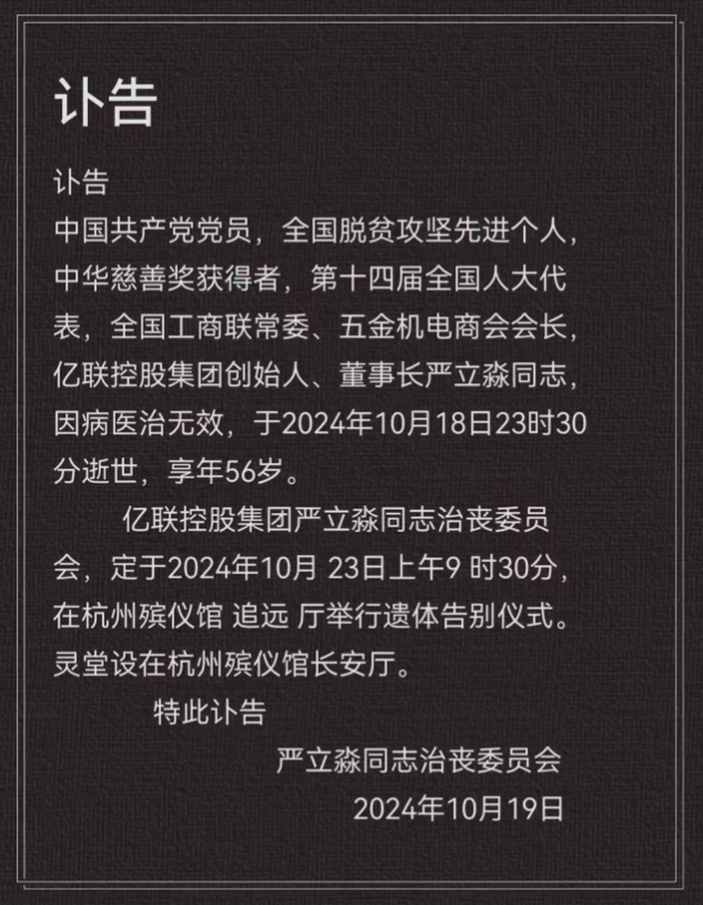 10月19日,严立淼同志治丧委员会发布讣告,亿联控股集团创始人、董事长严立淼同志因病医治无效,于2024年10月18日23时30分逝世,享年56岁。
