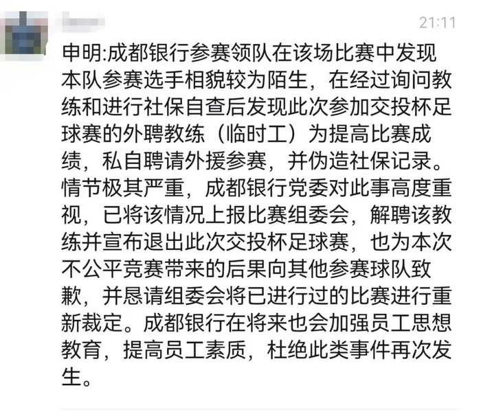 在10月24日举办的2024年成都交投杯足球赛H组比赛中,成都银行队以13比1战胜省委办公厅队。10月26日,有网友发文称,此次比赛中,成都银行外聘教练为提高比赛成绩,私自聘请外援参赛,并伪造社保记录。