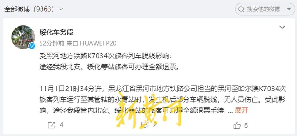 11月2日凌晨,哈尔滨铁路局绥化车务段官方微博发布通报:11月1日21时34分许,黑龙江省黑河市地方铁路公司担当的黑河至哈尔滨K7034次旅客列车运行至其管辖的永青站时,发生机后部分车辆脱线,无人员伤亡。受此影响,途经我段管内北安、绥化等站的旅客可办理全额退票手续。