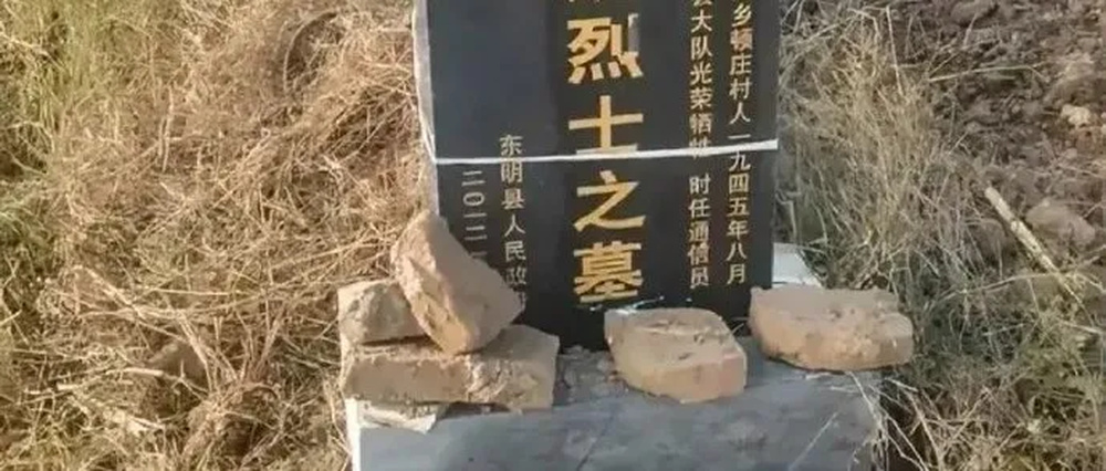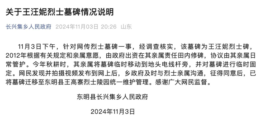 11月3日下午,针对网传烈士墓碑一事,经调查核实,该墓碑为王汪妮烈士碑,2012年根据有关规定和亲属意愿,由政府出资在其亲属责任田内修碑,协议由其亲属日常管护。今年秋耕时,其亲属将墓碑临时移动到地头电线杆旁,并对墓碑进行临时固定。网民发现并拍摄视频发布到网上后,乡政府及时与烈士亲属沟通,征得同意后,已将墓碑迁移至东明县王高寨烈士陵园统一维护管理。感谢广大网民监督。